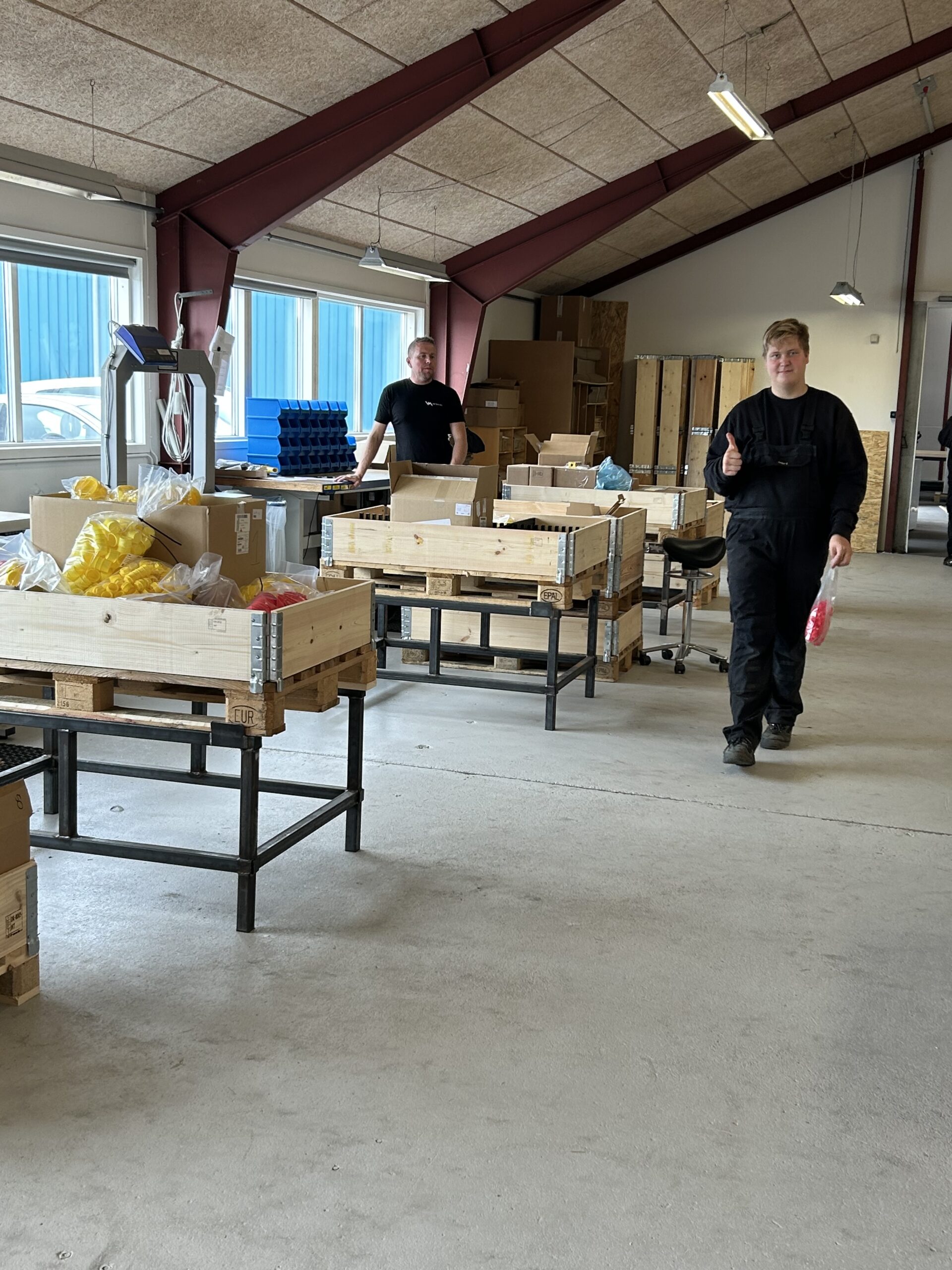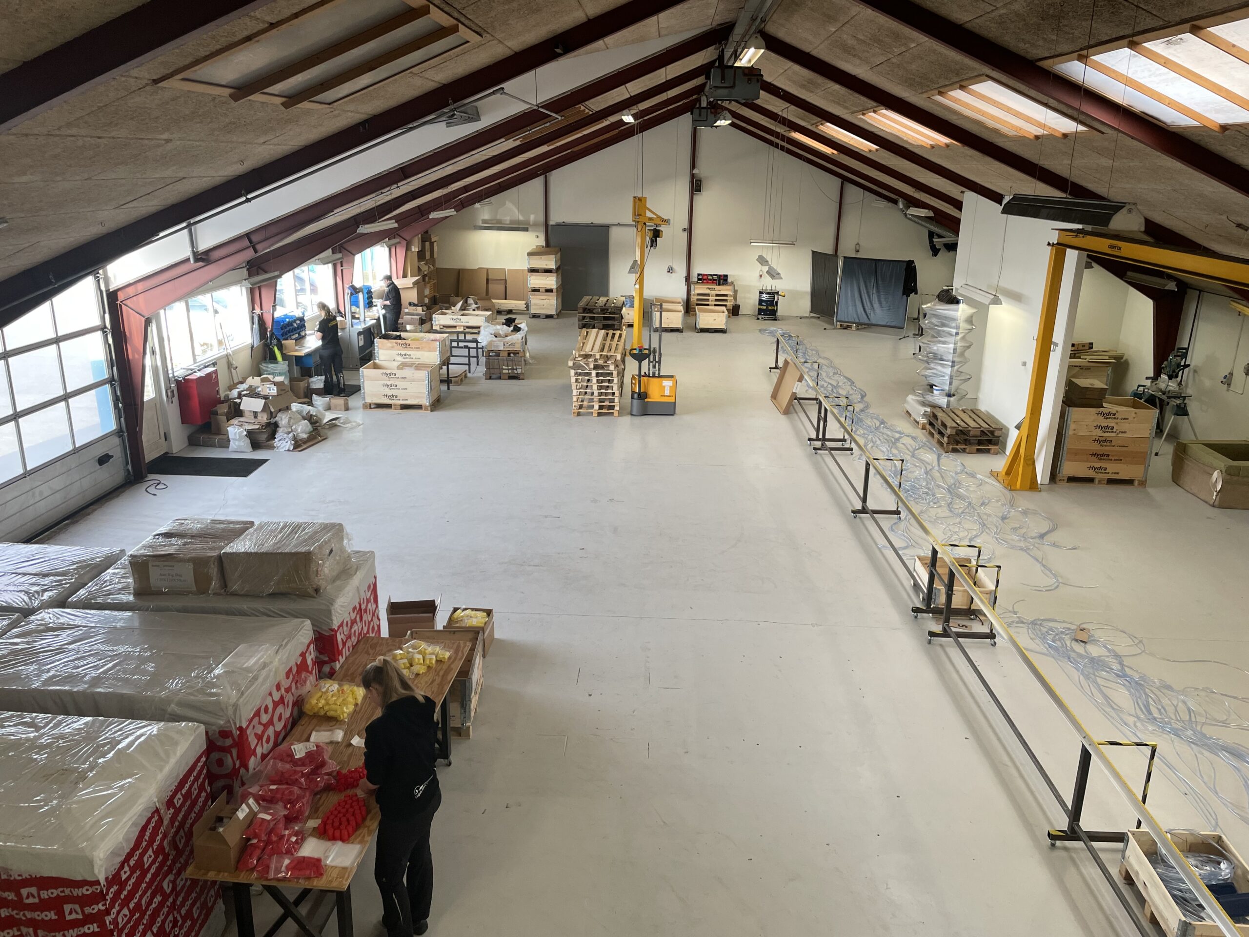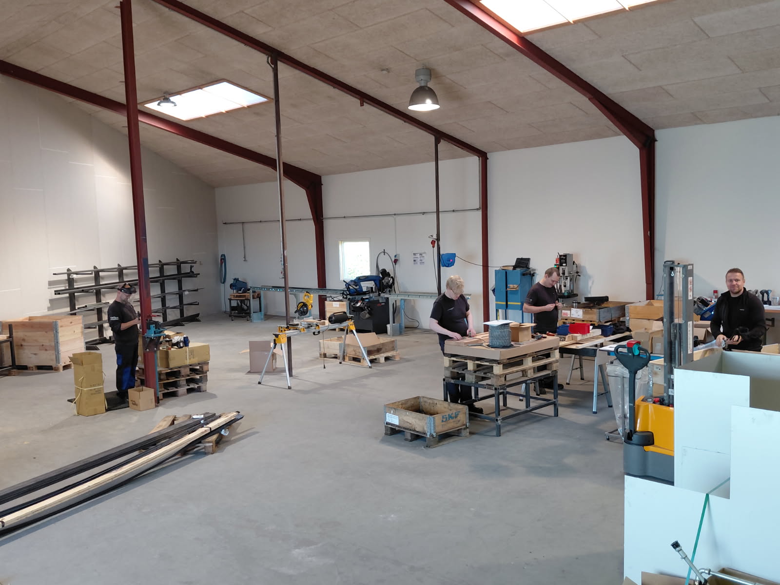 Her har vi et stort værksted hvor vi laver produktion og montage.