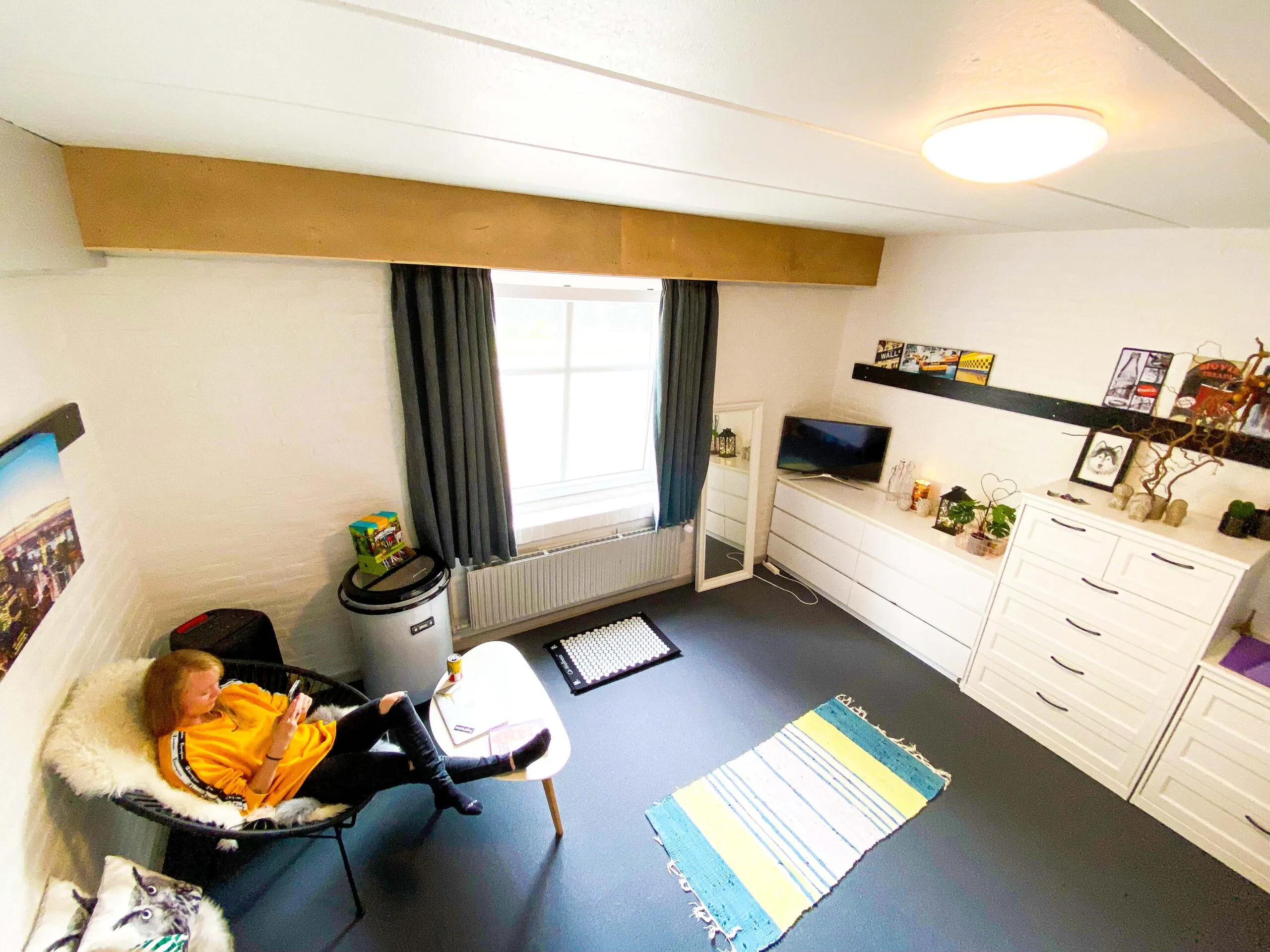 Melanie er elev på køkkenlinjen har ét stort værelse med eget bad, toilet og entré. Hun har indrettet sig på en måde, så hun kan slappe helt af når hun kommer hjem.